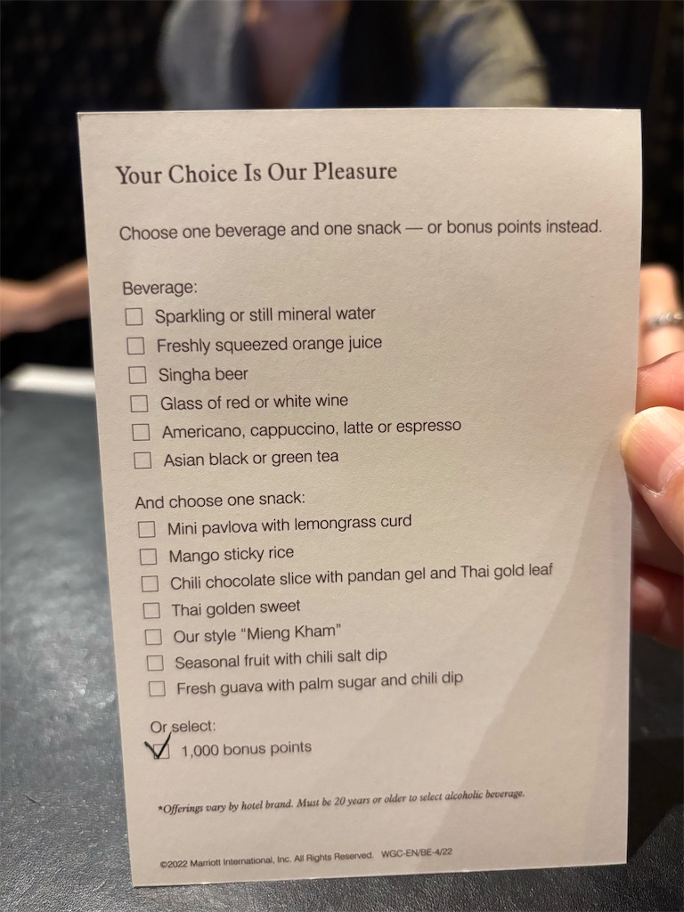 プラチナ特典のウェルカムギフトは、スナック+ドリンク または 1,000ポイント のいずれかを選べます。私は1,000ポイントをチョイスしましたが、後から特典カードをよく見ると、マンゴースティッキーライス、ミヤンカム、パブロバ などタイらしいスナック類も豊富で、どれか試してみても良かったかなと思いました。ドリンクはワイン、水、ビール、オレンジジュース、カプチーノなどから選択可能でした。