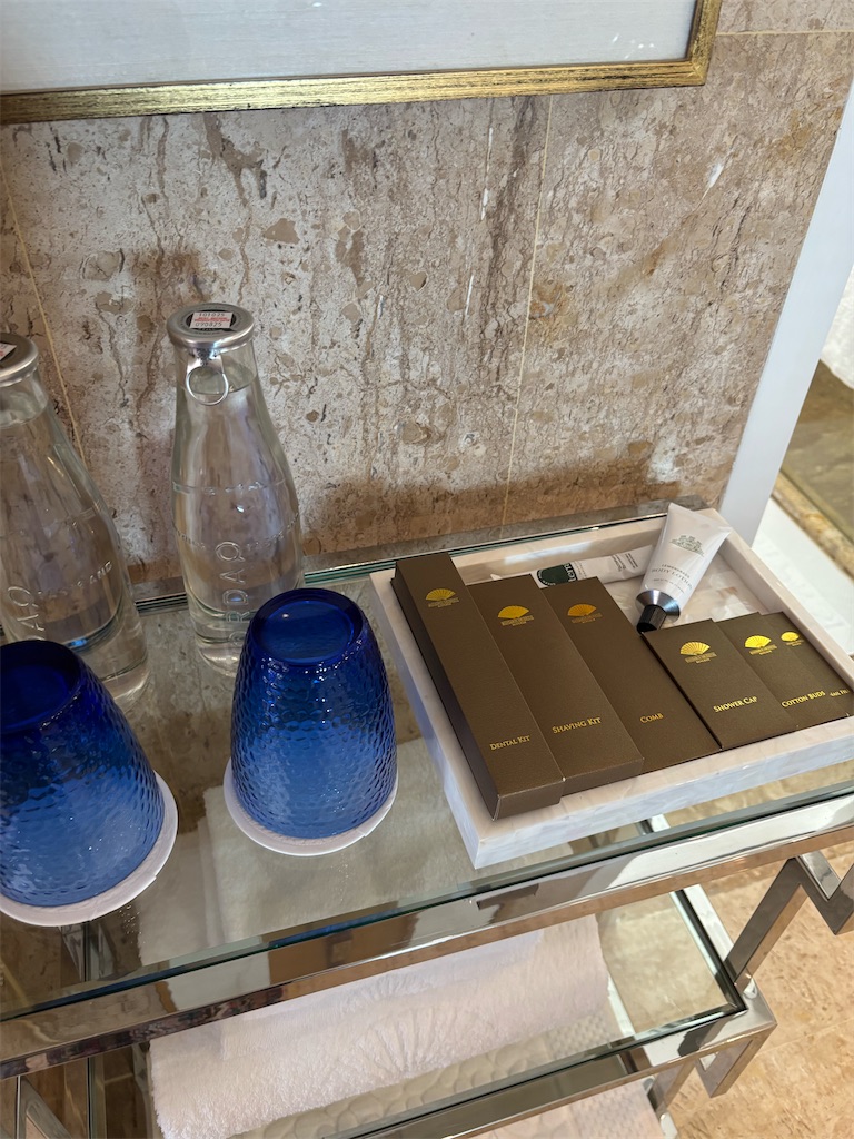 無料ミネラルウォーターも2本あり、洗面台にもボトル水が。これは歯磨きで使うみたいです。