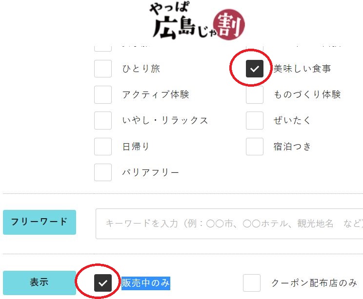 広島市、おいしい食事、販売中のみ、などを選択していきます。