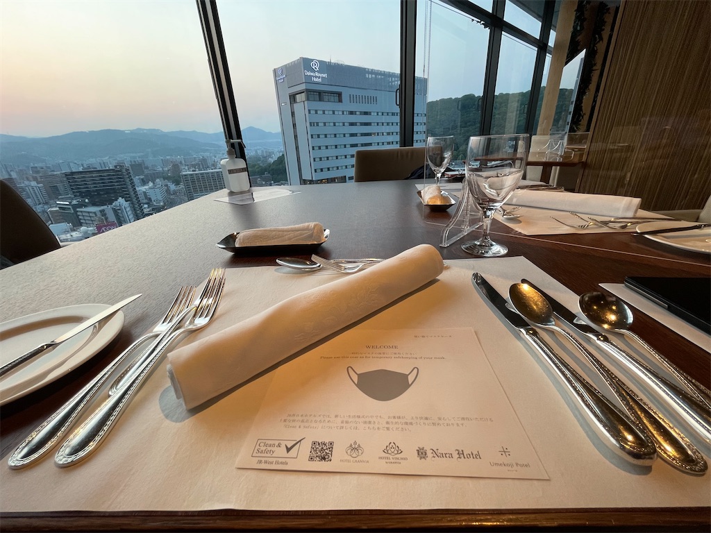 飲み物は別なので、夫が飲んだビールや私の飲み物はJR西日本ホテルズの割引がきき、ワインのペアリングの3杯のみは割引適用外でした。