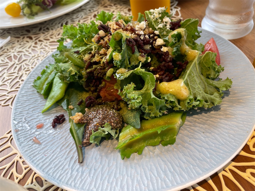 中身はハンダマ、キヌア、チアシードなどのスーパーフード、黒紫米、島ハーブやフルーツトマトなど。量が多いのでハーフ、シェアなどもできます。