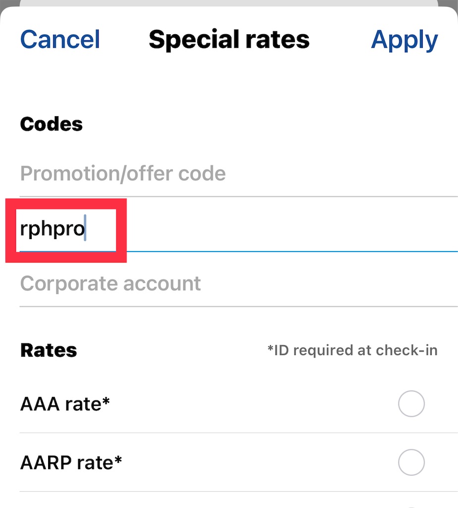 ヒルトンのサイト、またはアプリに直接ログインし、グループコードrphproをいれてもHPCJ予約料金が出てきます。