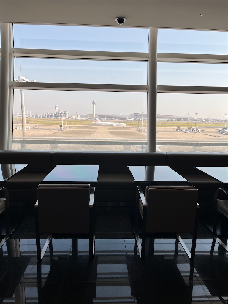 ボックス風の個室っぽい席が人気のようで陣取っている方々もおられましたが私たちは飛行機が見たいし外の見える窓際に案内してもらいました。