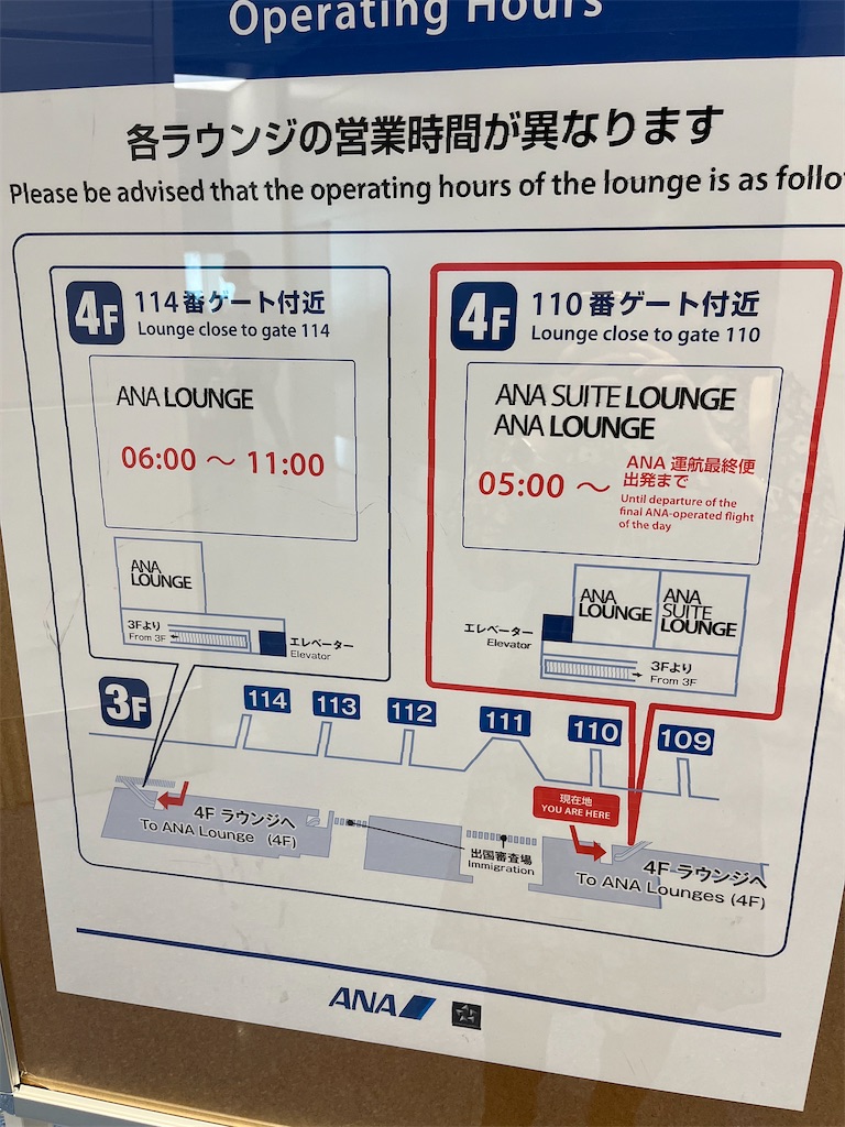 110番ゲート近くのANAラウンジ・ANAスイートラウンジ:5:00~ANA運航便最終便出発まで